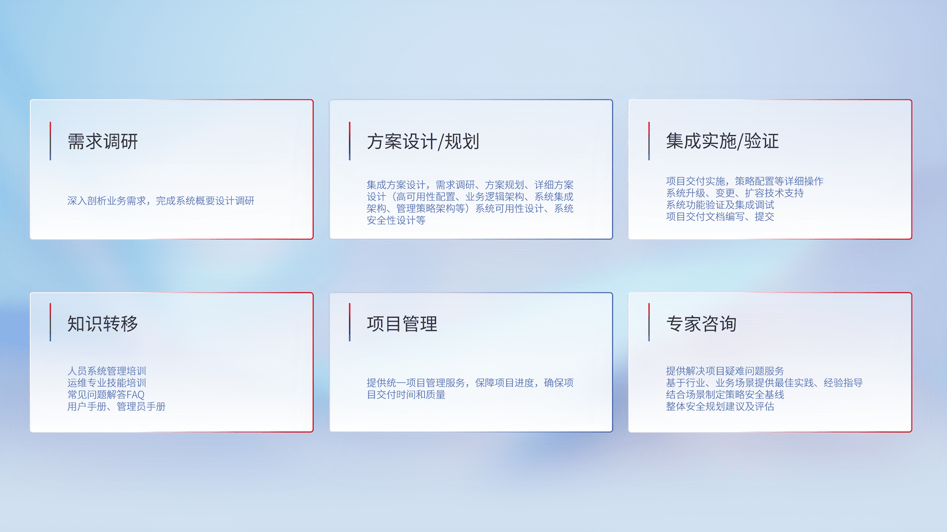 针对客户行业特性,,,将宏观的安全战略和需求,,,,通过专业的交付服务,,实现项目落地,,为客户提供标准规范的集成交付服务。。